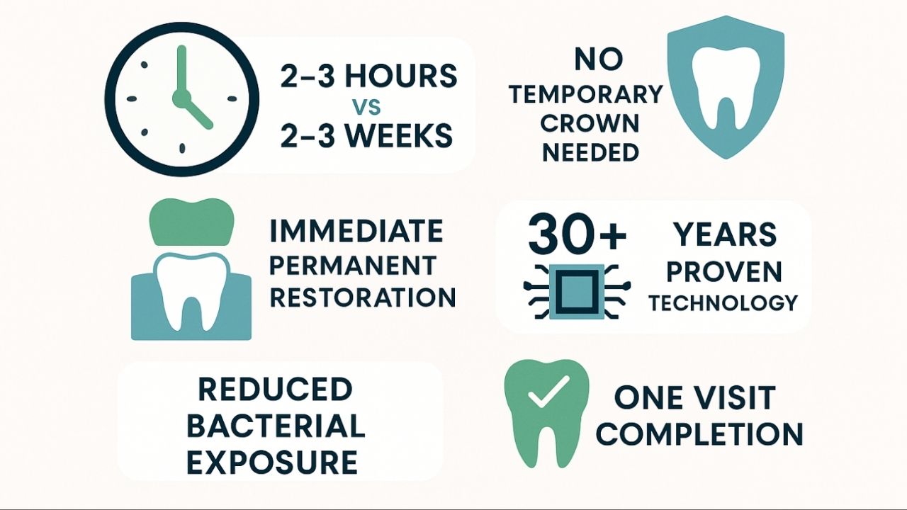 A prepared tooth under a temporary crown is exposed to bacterial invasion for 10-21 days in the traditional model. Even with a well-fitted temporary (which is rare), bacteria can seep through microscopic gaps. Your tooth structure is vulnerable. The clock is ticking. And every day increases the risk of infection, decay, or structural compromise.